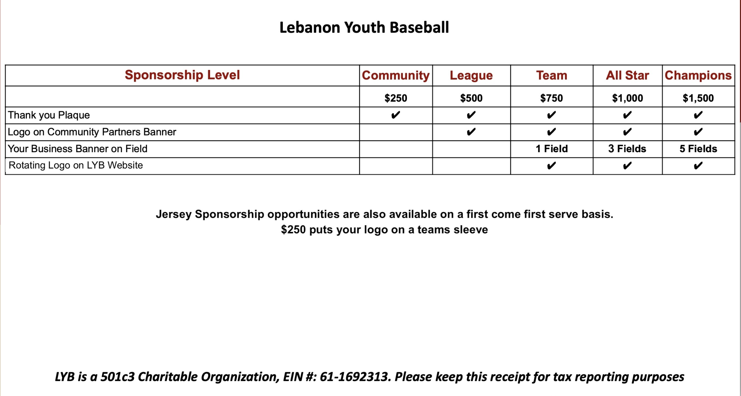 We look forward to a successful season in 2026 and we thank you for considering a partnership with Lebanon Youth Baseball.